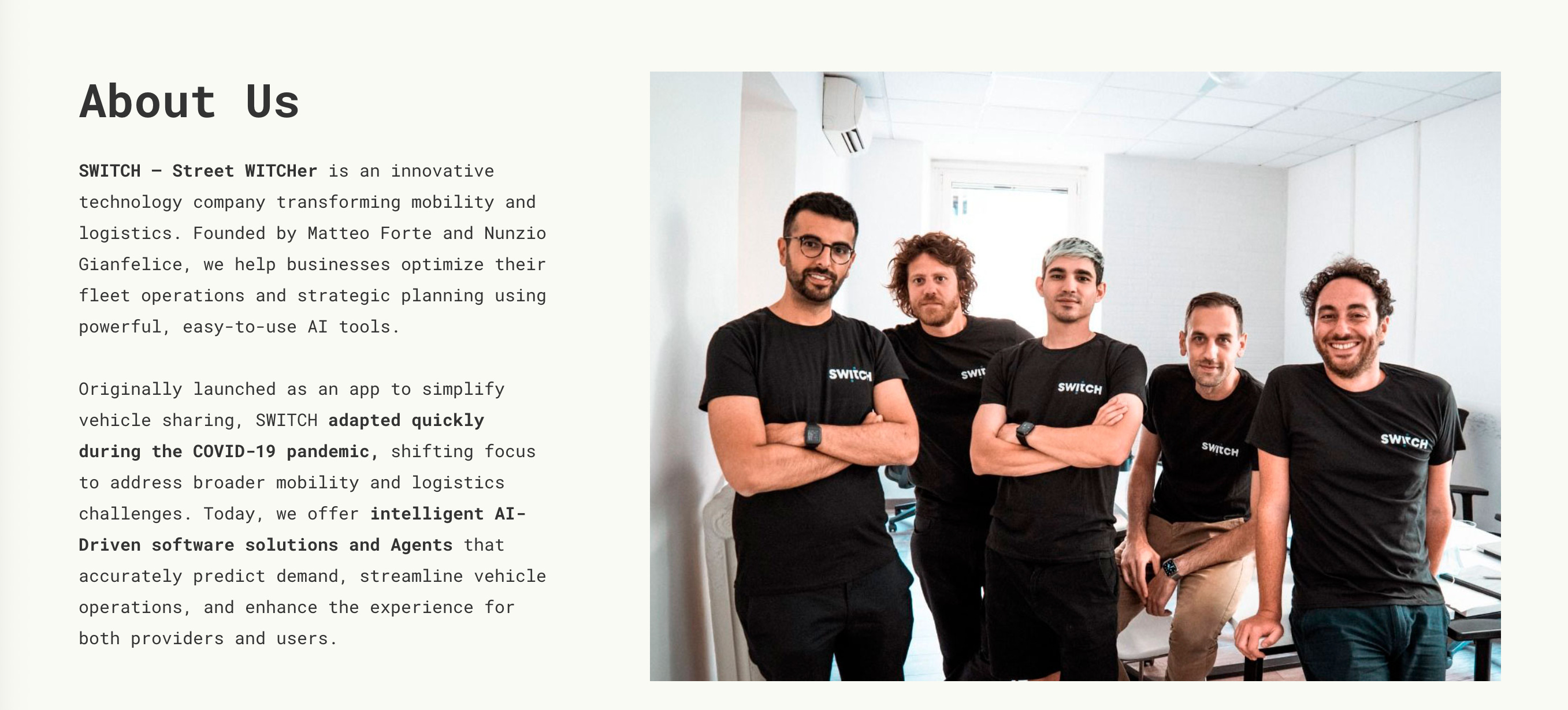 SWITCH is an Italian startup founded by Matteo Forte and Nunzio Gianfelice, two entrepreneurs with deep roots in AI, data science, and urban mobility. Together with a growing technical team, they’ve focused on helping fleet operators and mobility tech companies unlock the full potential of their data — making operations smarter, more efficient, and driven by real-time intelligence.
